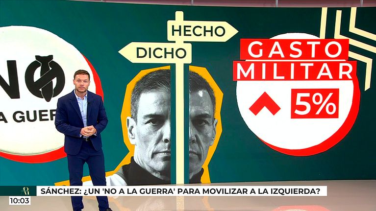 El programa analiza el debate político tras las últimas decisiones del Gobierno en materia de defensa. Mientras el Ejecutivo mantiene el mensaje de "no a la guerra", el aumento del gasto militar vuelve a abrir la discusión sobre su impacto político y si busca movilizar al electorado de izquierdas.