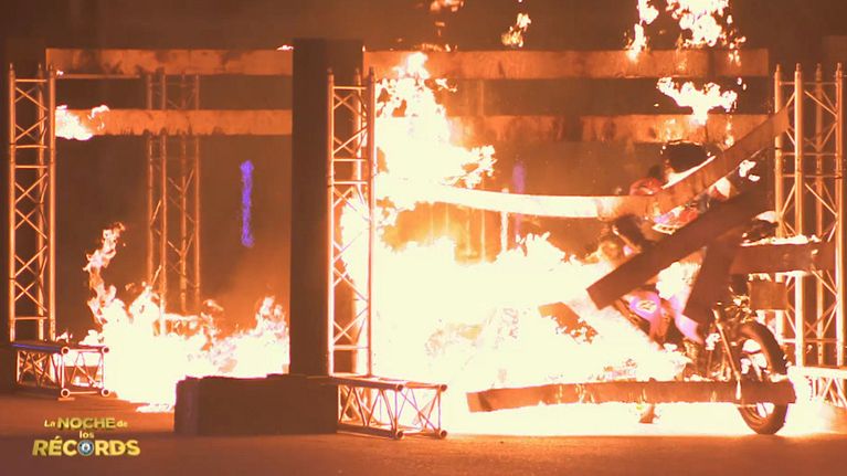 Dori protagoniza el momento más tenso de 'La noche de los récords' al atravesar un túnel de fuego con la moto