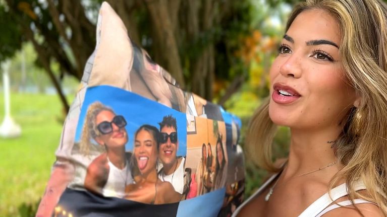 La creadora de contenido ha decidido llevarse un objeto muy personal, se trata de un cojín personalizado con todas las fotos de sus amigos y familia: ''Llevo un par de días hablándole a la almohada, allí lo haré mucho. Me reconforta ver sus caras, me siento más cerca de casa''.