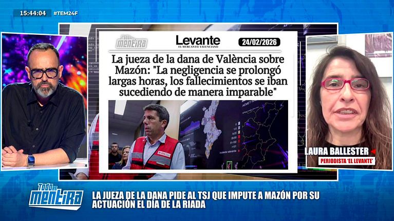 Laura Ballester, periodista de 'Levante-EMV', interviene en 'Todo es mentira' para dar más detalles sobre las últimas informaciones acerca de la DANA de Valencia y de Mazón, después de que la jueza encargada de la investigación haya solicitado al Tribunal Superior de Justicia que impute al expresident de la Generalitat valenciana y todavía diputado de las Cortes por su actuación el día de la riada.