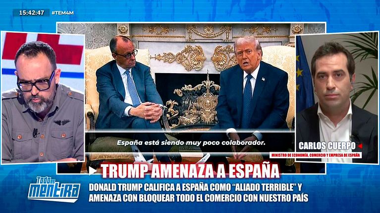 El ministro de Economía, Comercio y Empresa del Gobierno de España, Carlos Cuerpo, interviene en directo en 'Todo es mentira' para tratar de dar respuesta a todos los interrogantes que se han abierto con el conflicto en Oriente Medio y la amenaza de Donald Trump, presidente de Estados Unidos, de cortar el comercio con nuestro país.